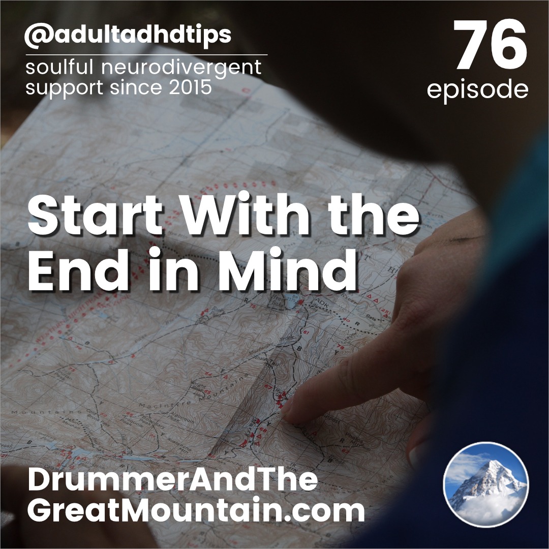 Adult ADHD ADD Tips and Support Podcast – Start With the End in Mind. This podcast is an audio companion to the book “The Drummer and the Great Mountain – A Guidebook to Transforming Adult ADD / ADHD.”