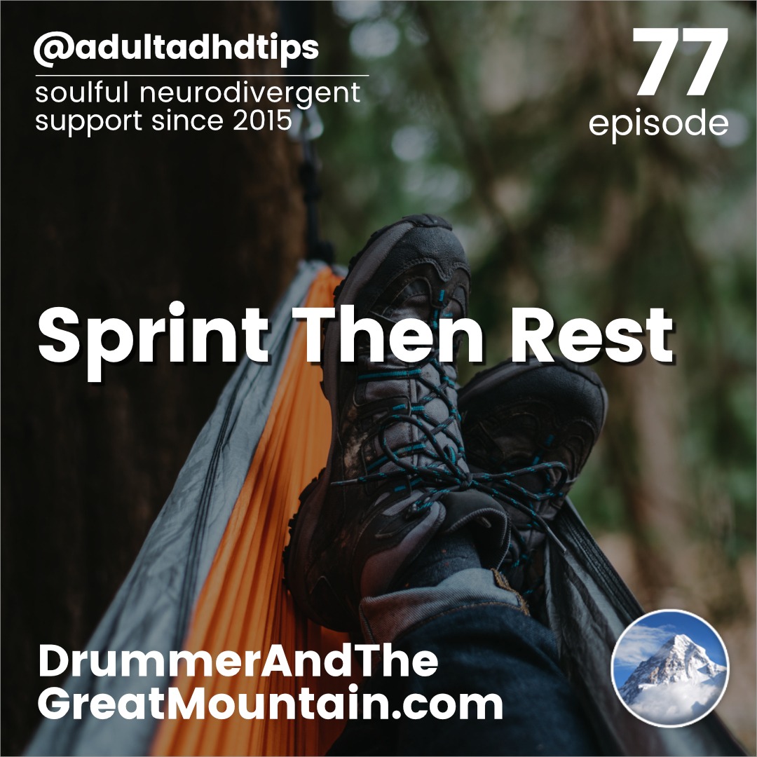 Adult ADHD ADD Tips and Support Podcast – Sprint Then Rest. This podcast is an audio companion to the book “The Drummer and the Great Mountain – A Guidebook to Transforming Adult ADD / ADHD.”