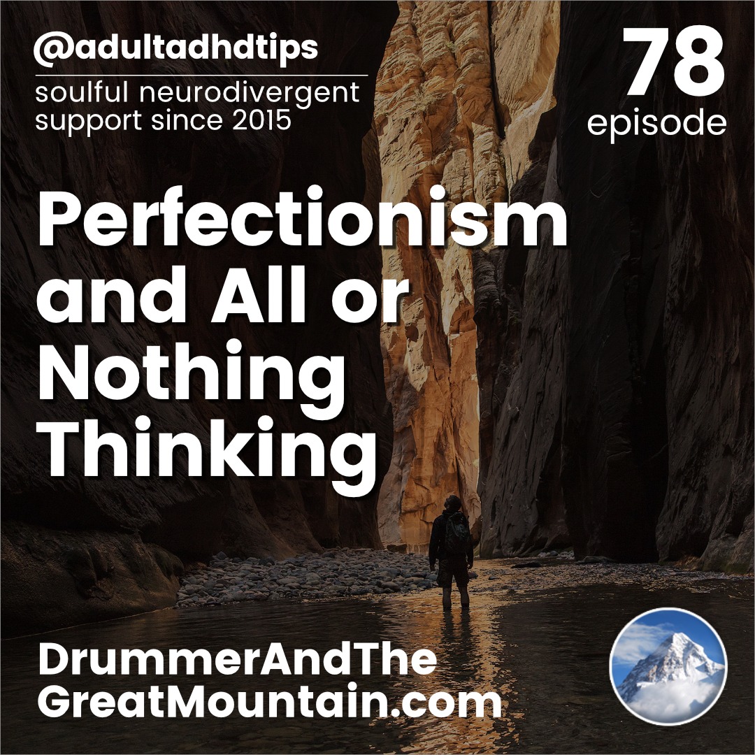 Adult ADHD ADD Tips and Support Podcast – Perfectionism and “All or Nothing” Thinking. This podcast is an audio companion to the book “The Drummer and the Great Mountain – A Guidebook to Transforming Adult ADD / ADHD.”