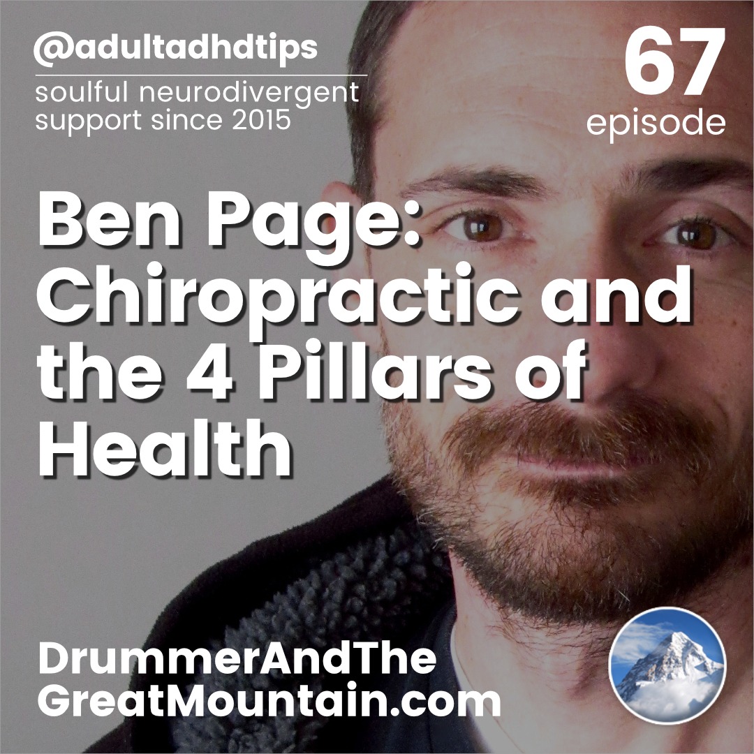 Adult ADHD ADD Tips and Support Podcast – Ben Page: Chiropractic and the 4 Pillars of Health. This podcast is an audio companion to the book “The Drummer and the Great Mountain – A Guidebook to Transforming Adult ADD / ADHD.”