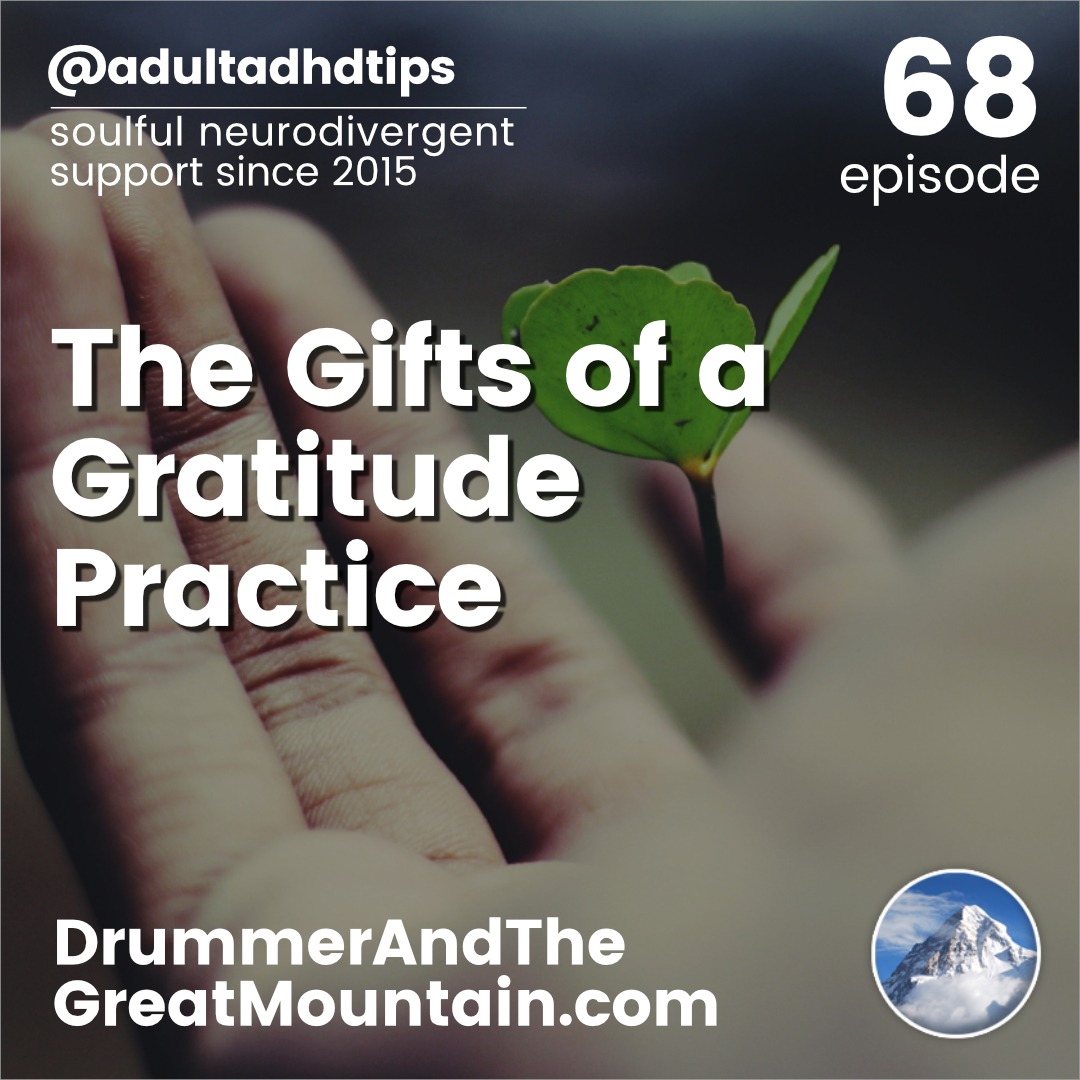 Adult ADHD ADD Tips and Support Podcast – The Gifts of a Gratitude Practice. This podcast is an audio companion to the book “The Drummer and the Great Mountain – A Guidebook to Transforming Adult ADD / ADHD.”