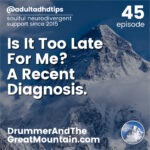 Is It Too Late For me? A Recent Diagnosis. This podcast is an audio companion to the book “The Drummer and the Great Mountain – A Guidebook to Transforming Adult ADD / ADHD.” Whether you are 30 or 70, if you’re…